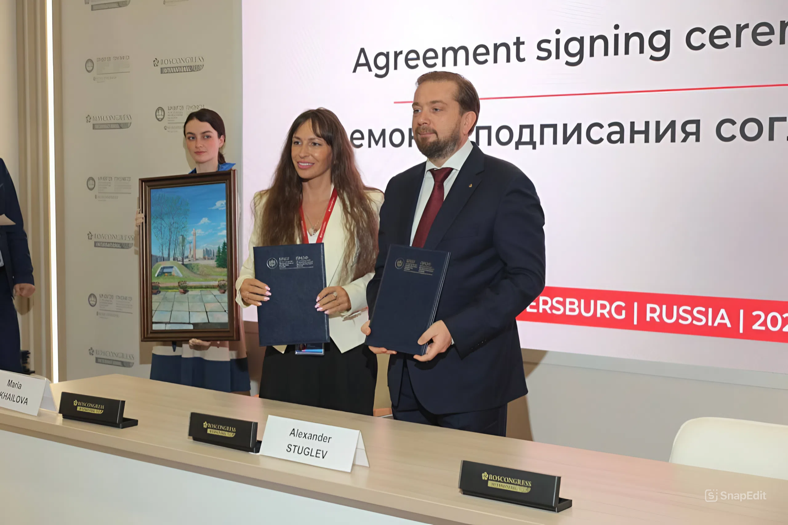 «После подписания мы от имени "ИнФинТеха" и "Росконгресса" обменялись памятными подарками. Со своей стороны мы подарили Фонду картину художника Ивана Галаничева, написанную им к 80-летию Великой Победы», — написала после мероприятия Мария Михайлова у себя в Telegram-канале.